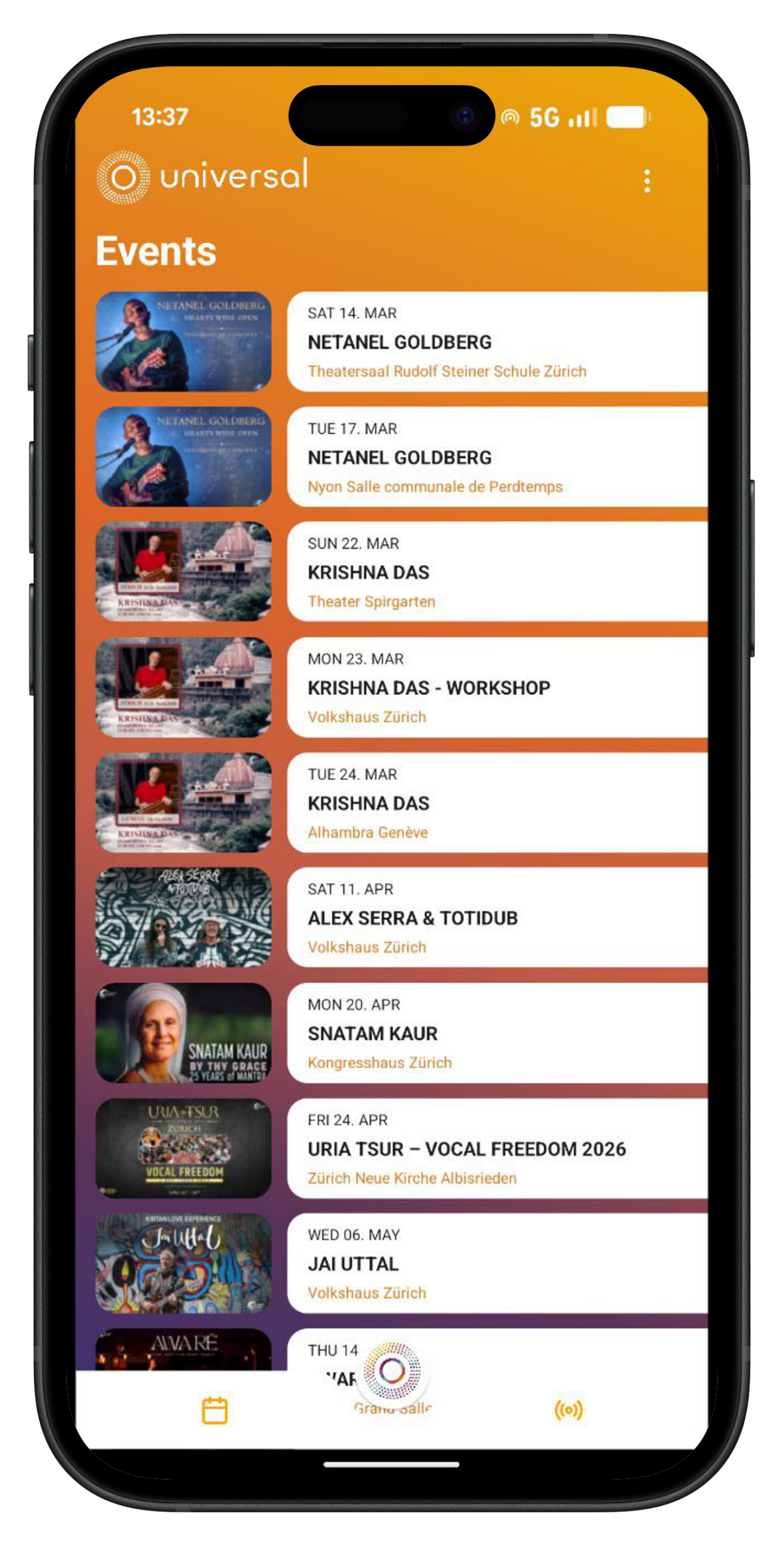 Das Universal App ermöglicht Menschen mit herzerfüllender Musik und weiteren erhebenden Inhalten fürs Leben inspiriert zu werden. Es ist eine Plattform für Herzensvernetzung und Austausch, Veranstaltungen und Gatherings.